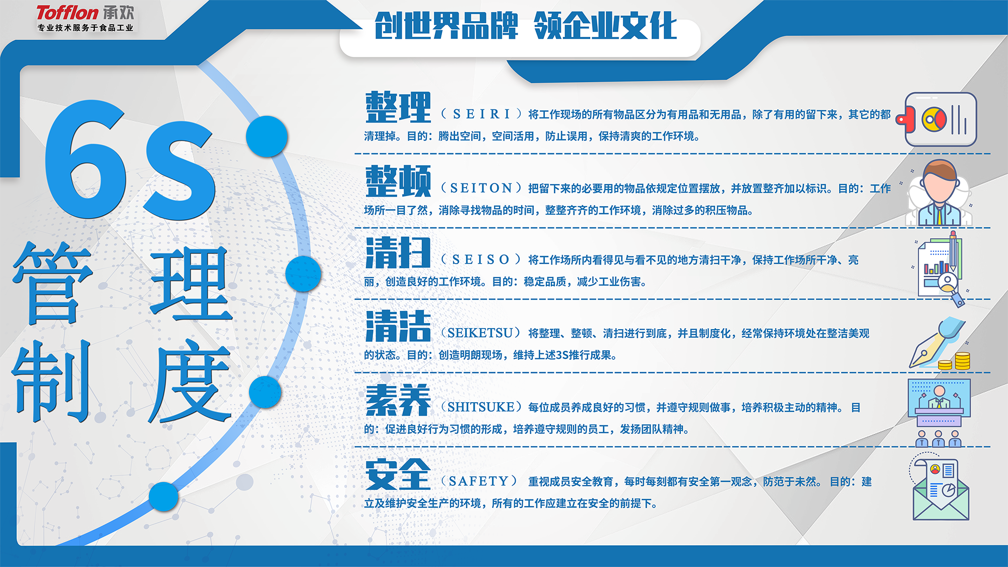 6S management is the upgrade of 5S, which means Seiri, Seiton, Seiso, Seiketsu, Shitsuke and safety. In order to ensure the normal production order of the workshop, ensure the smooth progress of production, and continuously create a good working environment, Tofflon Joy implements the 6S management system of the production workshop.