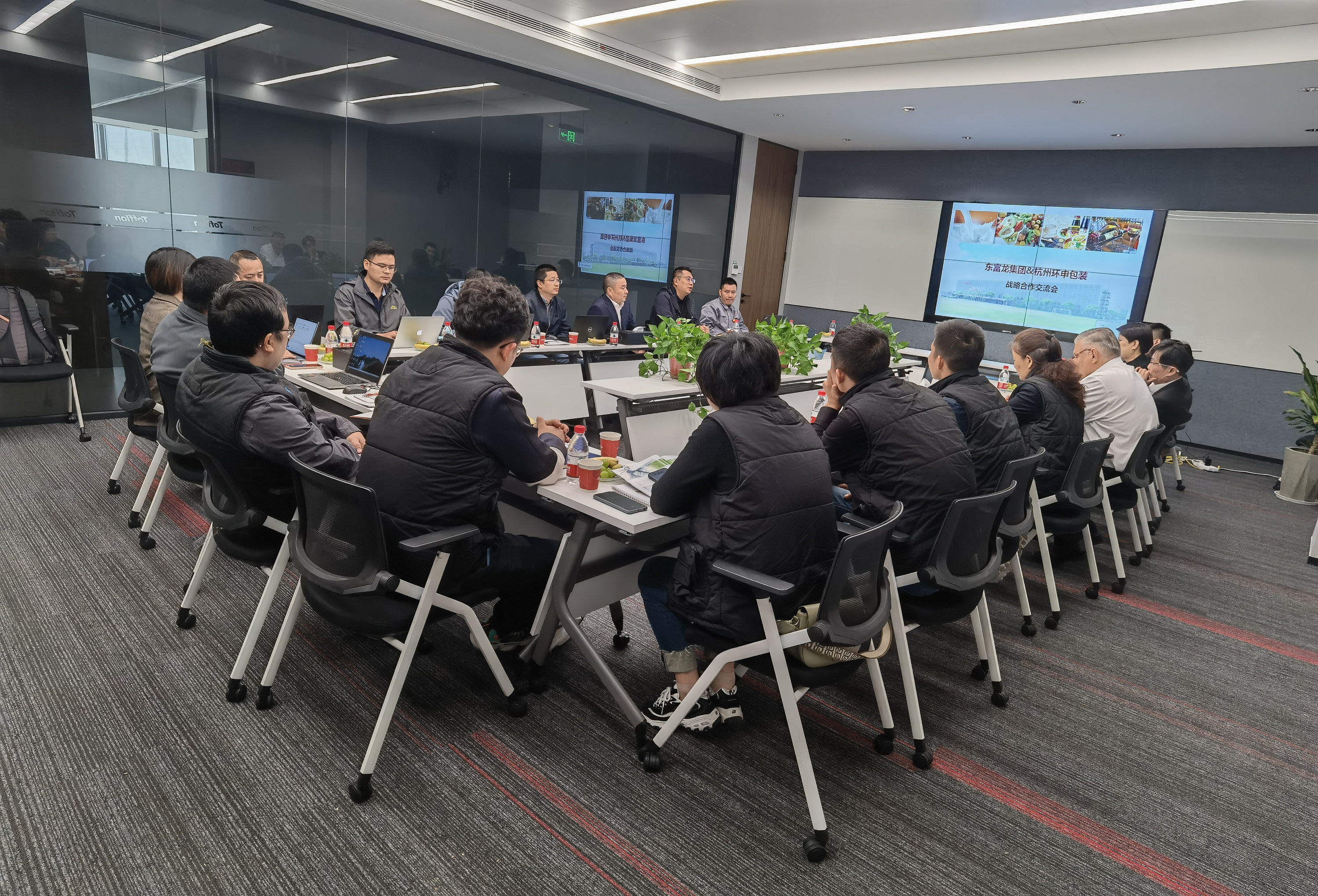 东富龙食品工程事业部,专注于液态食品加工关键技术及核心工艺的研发,提供从原料处理、产品灌装到后道包装一站式服务。制造研发的无菌杀菌灌装系统拥有10多项专利技术,与环申新材的无菌袋产品有着紧密的适配关系。会议期间,双方技术与销售对全球液态行业无菌袋市场进行分析,共同探讨了饮料无菌处理、杀菌灌装和包装的关键技术,寻找最佳的工艺处理及包装解决方案,共话发展新思路与新方向,并达成了强烈的战略合作共识,力求实现绿色智能制造与绿色包装的共享共赢。