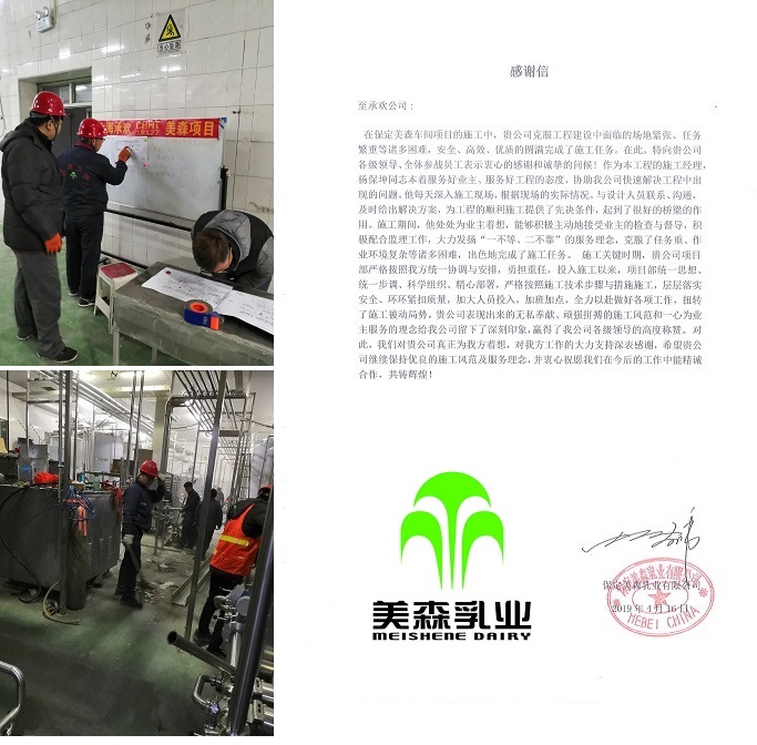 近日,东富龙食品工程事业部收到了一封来自保定美森乳业的感谢信,信中对现场人员面临场地紧张,任务繁重,环境复杂等困难,安全、高效、优质的圆满完成施工任务,表示了衷心的感谢,并对东富龙承欢顽强拼搏的施工风范和服务理念,进行了高度称赞!一封感谢信,简单几百字,却饱含美森乳业对我们的浓浓感激之情,更是对东富龙承欢长期以来不断提升服务品质的回馈和认可!