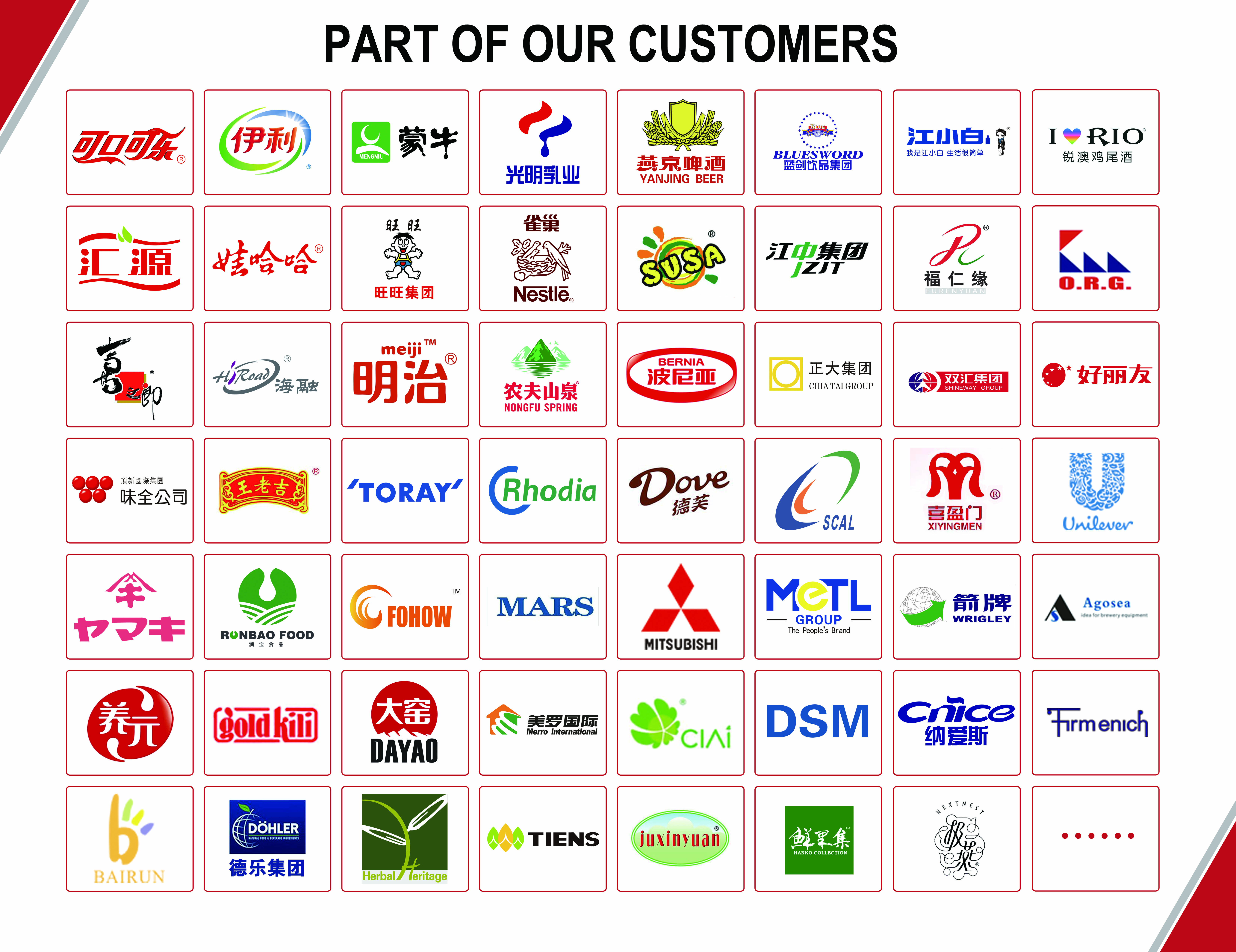 经过行业内多年工程项目建设的经验积累,已成为食品行业内多家大型知名企业的长期优质服务商;同时与国际工程公司合作,为众多国外工程企业的国内业务提供装备与服务。除此之外,公司自身也积极开拓海外市场,产品先后出口到美国、法国、澳大利亚、新加坡、加拿大、埃塞俄比亚、尼日利亚、孟加拉等国家。
